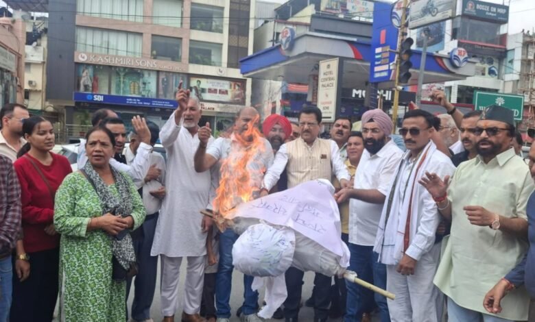जॉर्ज एवरेस्ट पार्क आवंटन घोटाले के खिलाफ कांग्रेस ने प्रदेश भर में प्रदर्शन कर राज्य सरकार का फूंका पुतला