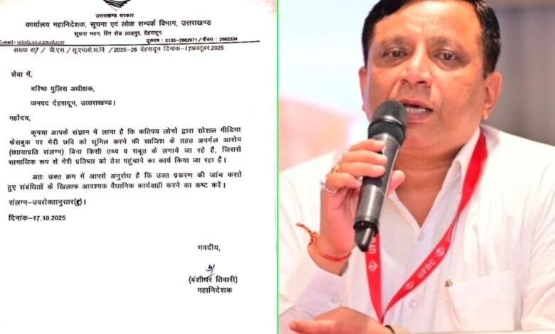 डीजी सूचना बंशीधर तिवारी ने पत्र में कहा है कि “कतिपय व्यक्तियों द्वारा सोशल मीडिया पर मेरी छवि को धूमिल करने की साजिश के तहत बिना किसी तथ्य के आरोप लगाए जा रहे हैं, जिससे मेरी सामाजिक प्रतिष्ठा को ठेस पहुँच रही है।” उन्होंने इस मामले में दोषियों की पहचान कर कार्रवाई करने का अनुरोध किया है। सूत्रों के अनुसार, उन्होंने संबंधित पोस्टों और फेक आईडी के स्क्रीनशॉट भी पुलिस को सौंपे हैं।