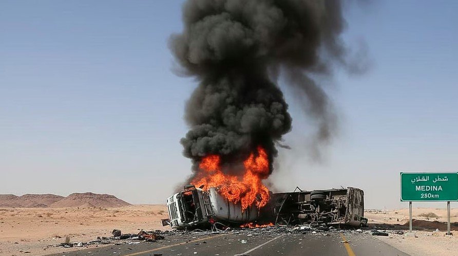 स्थानीय मीडिया रिपोर्टों के मुताबिक, मक्का से मदीना जा रही बस मदीना से लगभग 160 किलोमीटर दूर मुहरास/मुफरिआत क्षेत्र में एक डीज़ल टैंकर से जा टकराई। हादसा तड़के करीब 1:30 बजे हुआ, जब अधिकांश यात्री गहरी नींद में थे। टक्कर के तुरंत बाद बस में आग लग गई, जिससे कई लोग बच नहीं सके। घटना की भयावहता इतनी थी कि कई शवों की शिनाख्त करना भी मुश्किल बताया जा रहा है। शुरुआती अनुमानों में कम से कम 42 लोगों के मारे जाने की सूचना है। मृतकों में महिलाएं और बच्चे भी शामिल माने जा रहे हैं।