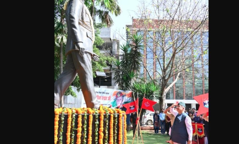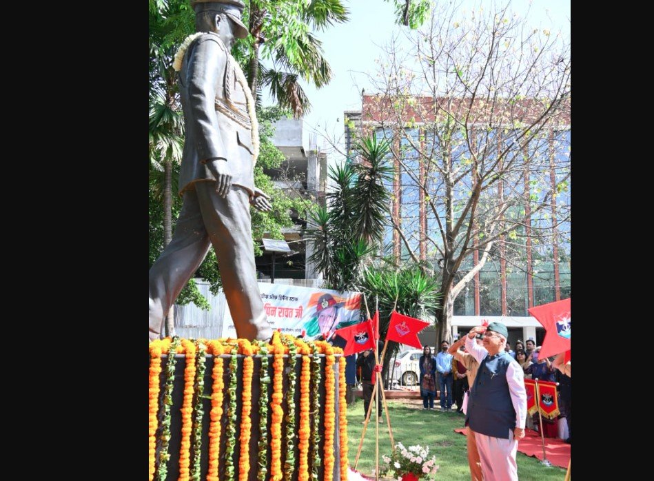 जनरल बिपिन रावत की जयंती पर उन्हें पुष्पचक्र अर्पित कर श्रद्धांजलि देते सैनिक कल्याण मंत्री गणेश जोशी