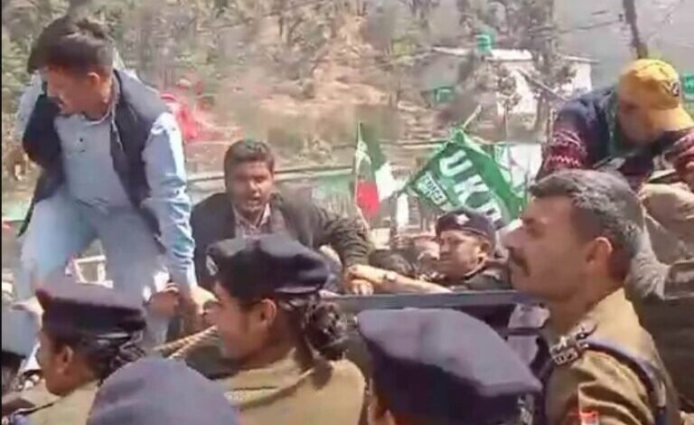 गैरसैंण। उत्तराखंड की ग्रीष्मकालीन राजधानी गैरसैंण में विधानसभा सत्र के दौरान उत्तराखंड क्रांति दल (यूकेडी) के कार्यकर्ताओं ने विभिन्न मांगों को लेकर प्रदर्शन किया। स्थायी राजधानी की घोषणा, अंकिता भंडारी हत्याकांड और अन्य जन मुद्दों को लेकर कार्यकर्ताओं ने सरकार के खिलाफ नारेबाजी करते हुए विधानसभा घेराव का प्रयास किया।